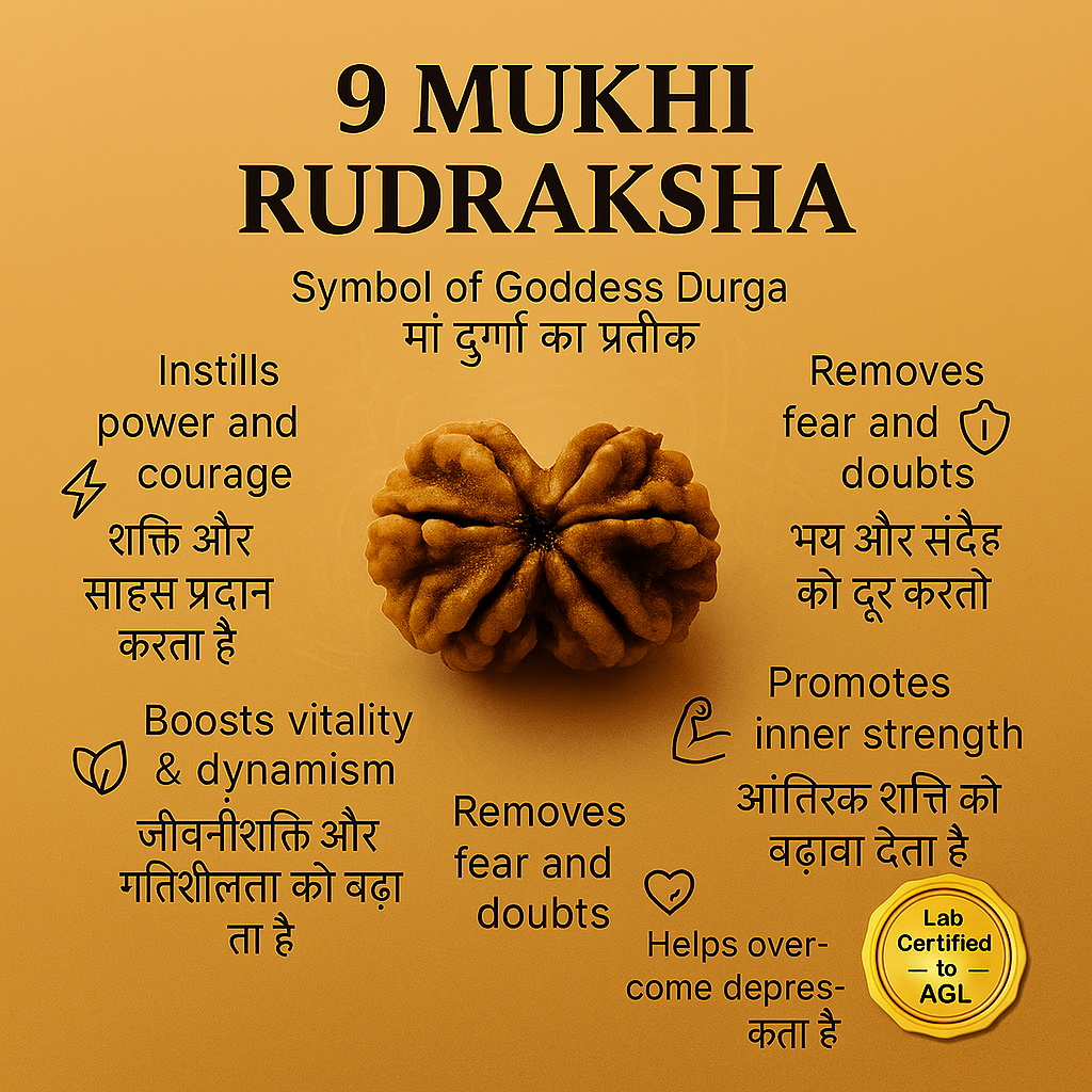 The 9 Mukhi Rudraksha is a sacred and powerful bead blessed by Goddess Durga, the embodiment of Shakti (divine feminine energy). Representing nine forms of Durga, this Rudraksha radiates strength, courage, protection, and fearlessness. It is believed to destroy negative energies, remove fear, and empower the wearer with confidence and determination.